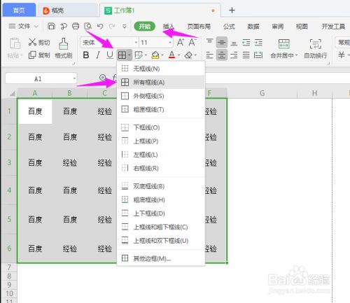 在起头下点击边框标记—所有框线。