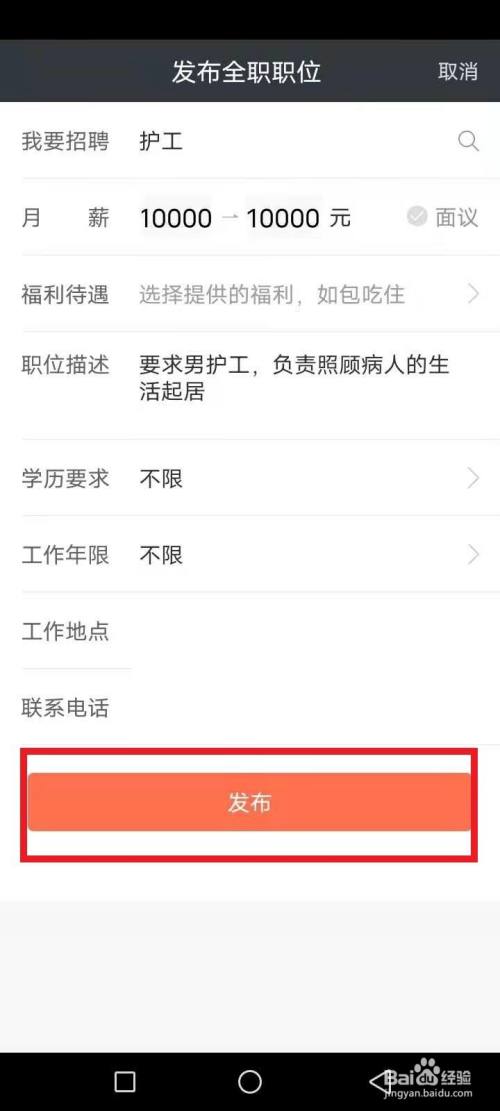 输入要求薪资等信息,点击发布,如图红色文本框: