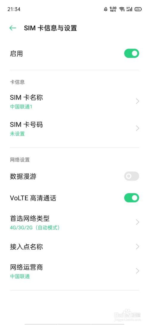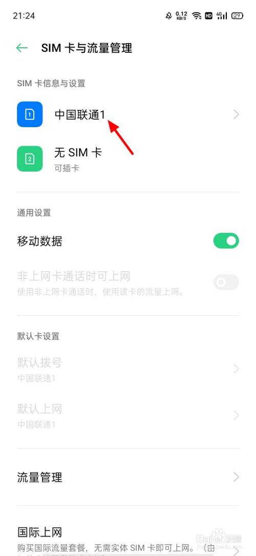在SIM卡与流量办理页面,选摘要设置的SIM卡,这里是中国联通;