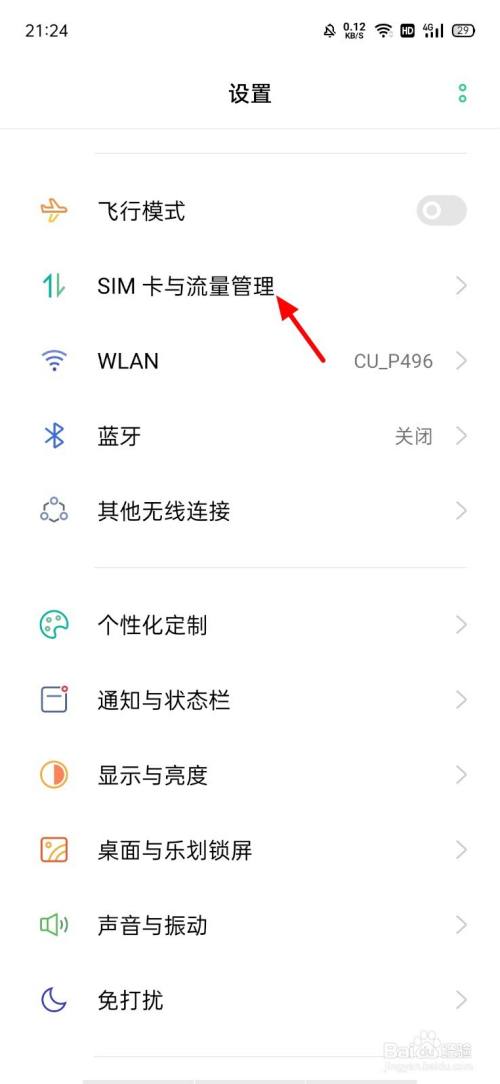 在设置页面,点击 SIM卡与流量办理;
