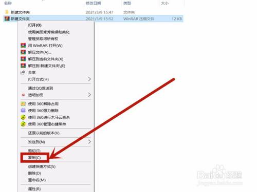 接着用鼠标“左击”选中压缩文件,再用鼠标“右击”,选择“复制”。