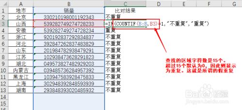 这类现象就是假反复,COUNTIF函数“掉灵”。其实是因为COUNTIF函数的查找区域的字符数最多是15个,跨越15个则默认为0,是以若前面15个字符一致,是后面的有差别,则会被显示为一致