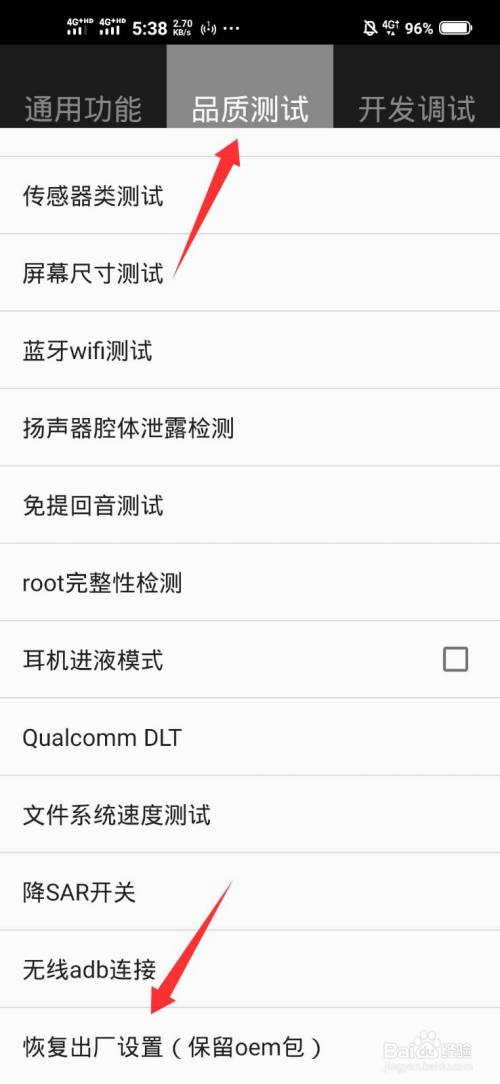 先点击品质测试,再点击恢复出厂设置即可。