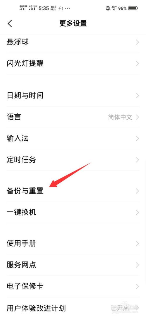 在更多设置页面点击备份与重置。