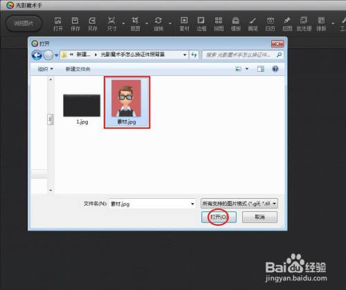 第二步:在弹出的打开对话框中,选中一张需要换布景的证件照,单击“打开”按钮。