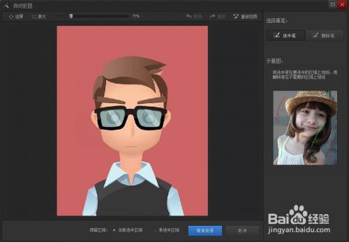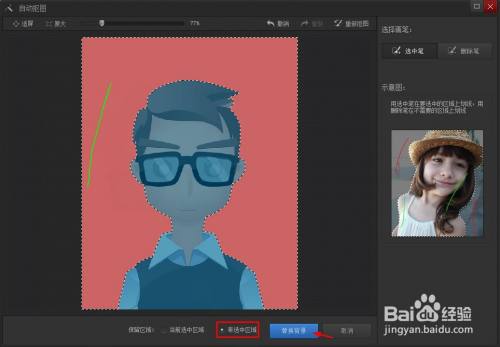 第四步:在主动抠图界面中,按住鼠标左键选中布景区域,鄙人方勾选上“非选中区域”,单击“替代布景”按钮。