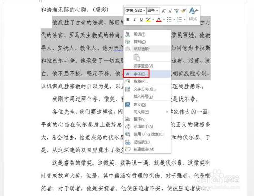 第二步:选中需要调节间距的文字,单击鼠标右键,选择“字体”。