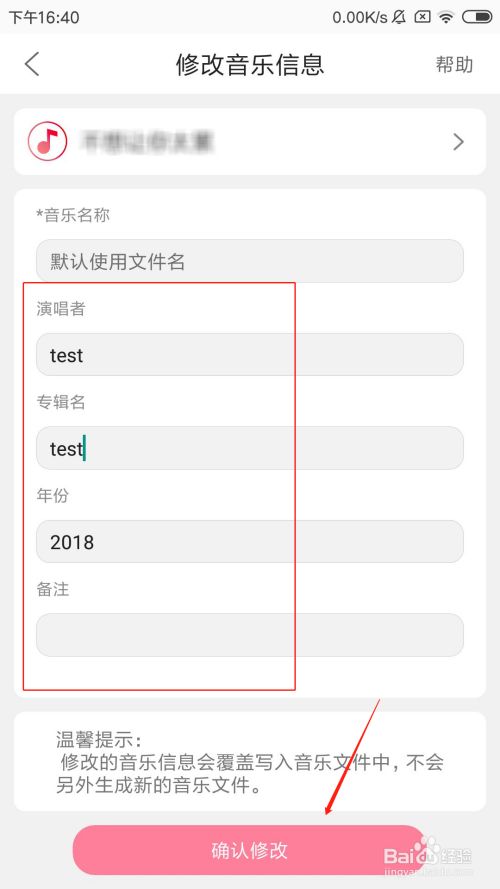 输入音乐演唱者、专辑名称和年份等信息之后,点击下方简直认点窜按钮。
