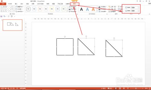 选择所有外形——格局——设置宽度和高度都是5厘米,两个三角形就是等腰直角三角形,就是设置直角边与正方形的边不异长度。