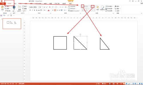 点击HOME——在画图中选择正方形和直角三角形,画一个正方形,两个直角三角形。
