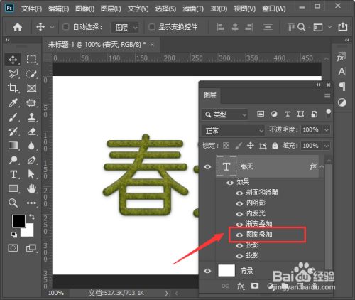 接下来,我们在文字图层中,双击【图案叠加】的文字打开,如图所示。
