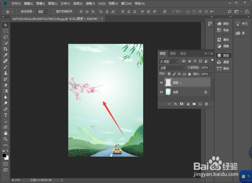 将花的素材直接拖入到布景图中,PS:因为花的素材是PNG格局的,是透明的,若是是其他格局的,需要抠图;