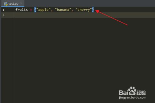 在python文件编纂区中,利用大括号界说一个“fruits”调集对象。