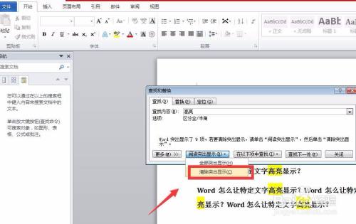 最后,若是想要打消高亮显示,也可以从头回到高级查找页面,点击凸起显示,在跳出的子菜单中选择打消高亮显示。