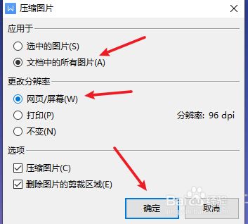 压缩图片页面,点击文档中的所有图片,更改分辩率(网页/屏幕),点击确定。
