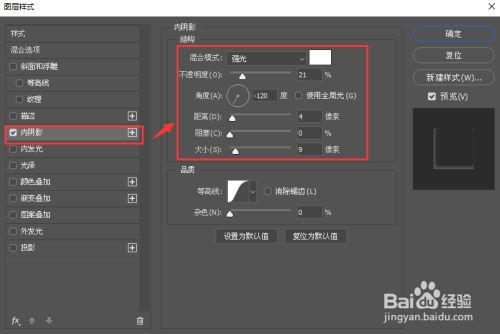 我们把内暗影的颜色设置为白色,然后调整不透明度、角度、距离和大小,如图所示。