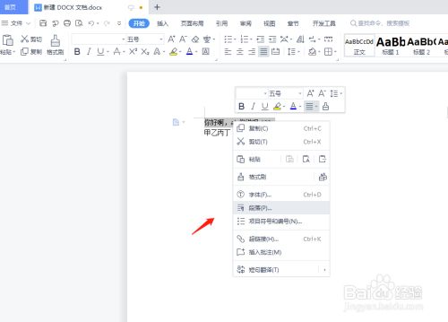点击鼠标右键,选中右侧菜单中的“段落”按钮。