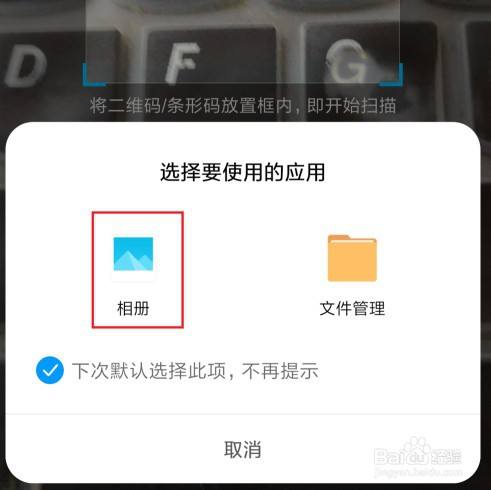 8、在弹出窗口中点击“相册”,然后点击我们方才保留的二维码图片。