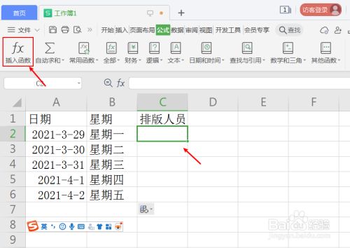 点击排版人员的单位格,在公式页面,点击“插入函数”。