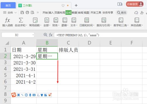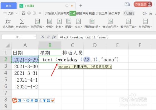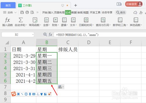 按照第一个日期单位格A2,设置礼拜函数=TEXT(WEEKDAY(A2,1),"aaaa")。