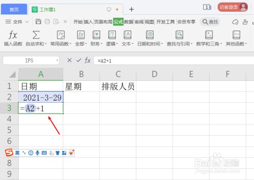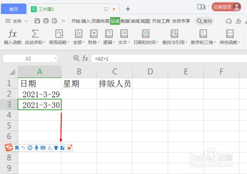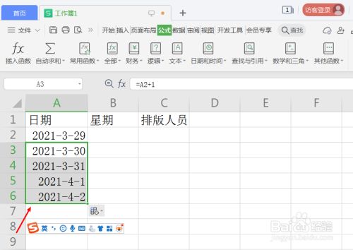 按照第一个日期单位格A2,设置第二个单位格日期函数“=A2+1”。