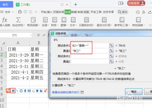 在函数参数页面,设置前提1,好比:当礼拜一,是张三,所以设置测试前提B2=“礼拜一”,真值为"张三”。
