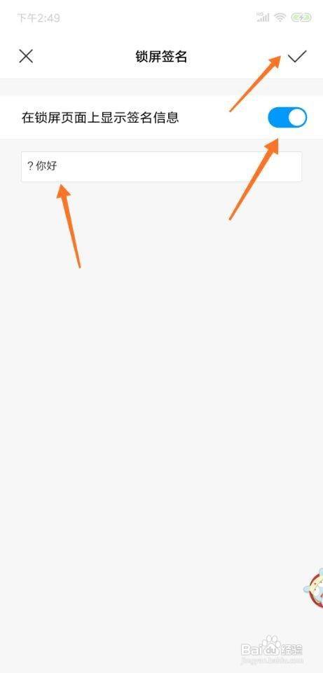 5、勾选在锁屏页面上显示签名信息,输入签名,点击√按钮。