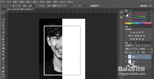 在“图层 1 ”图层,按M利用矩形选框东西,在图像中框选出右半部门,好了后;接着在右半部门的选区内,按Shift+F5填充白颜色,好了后点击‘确定’;然后按Ctrl+D打消选择