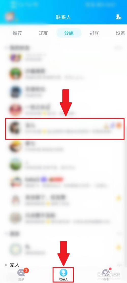 打开QQ首页,进入联系人界面,点击老友头像进入他的小我本家儿页。