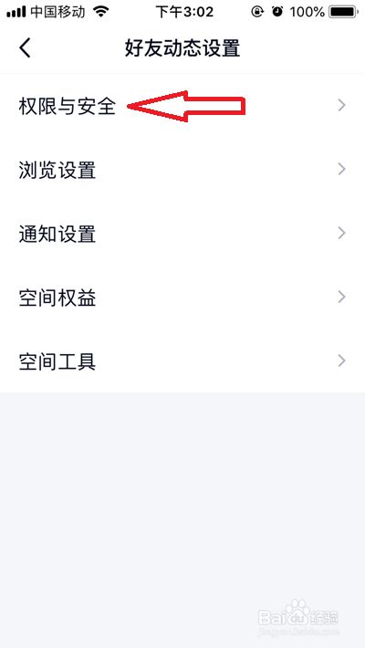 在老友动态设置页面,点击【权限与平安】