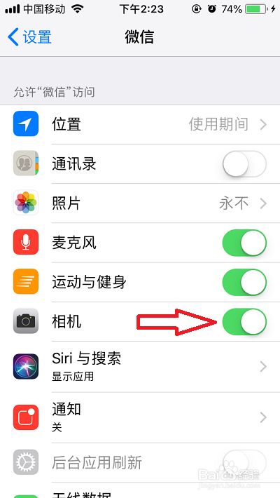 若我们不许可该app利用相机功能,我们将【相机】右侧的开关按钮点击封闭