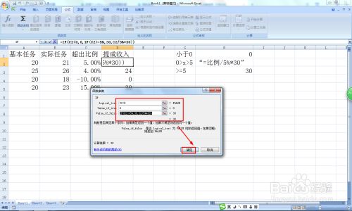第一个输入:C2<0,第二个输入:0,第三个输入:IF(C2>=5%,30,C2/5%*30)——点击确定——标的目的下填没收式。