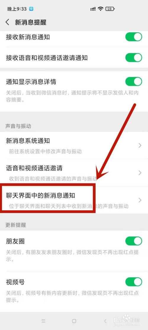 2.点击设置,再点击新动静提醒,进入聊天界面中的新动静提醒。