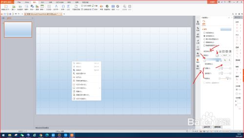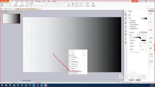 新建一个演示文档(即ppt),右击一空白页,在弹出的右键菜单选择“布景”,右边弹出布景属性设置,选择“渐变色填充”