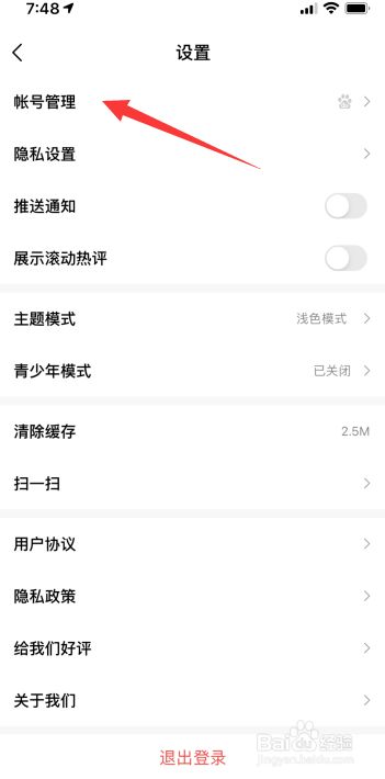 在设置页面,点击“账号办理”。