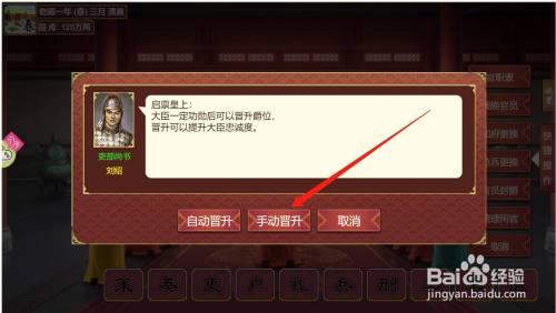 工具/原料联想威6 ProWindows10皇帝当作长打算2h5方式/步骤1起头游戏2点击宣政殿3点击吏4点击官员册封5点击手动晋升6选择您要册封的大臣,点击晋升7皇帝当作长打算2h5当作功给大臣册封END