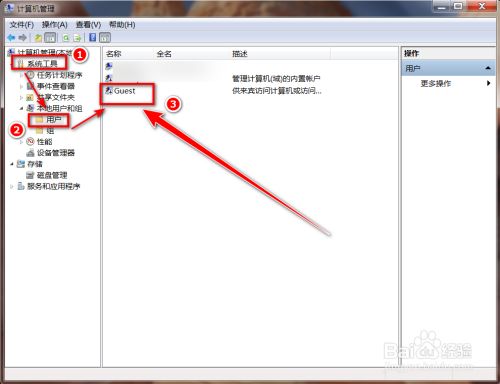 在“计较机办理”窗口里,点击“系统东西”,再点击“当地用户和组”,点击“用户”,最后双击中心窗口的“Guest”。