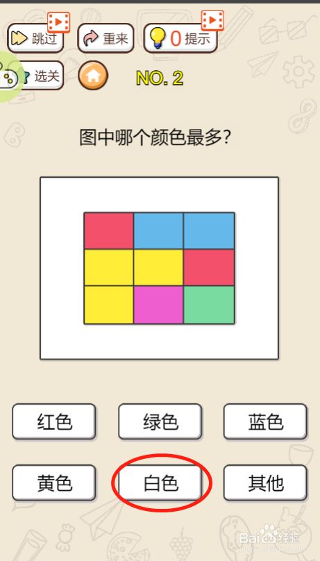 方式/步骤1首先看一下标题问题——让我们选择颜色占比最多的颜色2第一眼看下去黄色是最多的3这个时辰不难发现谜底里面还有一个白色给我们一点儿提醒4细心看图发现除了九个色块之外,最外边还有一片白色区域5所以这么看来占比最大的应该是白色6选择白色作为最终的谜底,这样子就可以过关了END
