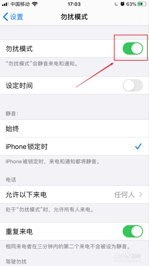 在勿扰模式界面将“勿扰模式”的开关按钮打开