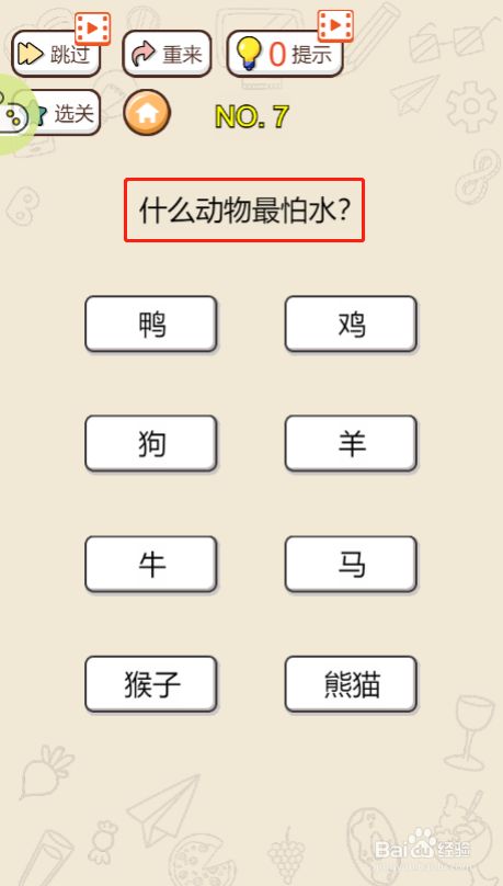 方式/步骤1首先我们看一下这一关的要求是什么2然后再看一下给我们的选项3选项中的动物没有较着怕水的,所以我们需要从此外角度对待这个问题4怕水无非就是三种:一种是会被淹死、一种是摄入过多水分会死、一种是怕湿,而在这些动物里面根基都没有5看到“鸡”和“湿”不难想到谐音梗——“鸡”不成“湿”6所以锁定最后的谜底就是“鸡”END