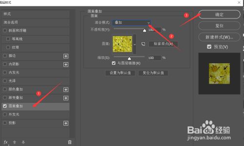 在弹出图层样式文本框中点击图案叠加—>更改夹杂模式为叠加,在图案文本框中选择一种图案,可按照需要更改图案叠加结果,更改完当作,点击确定即可