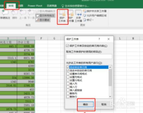 5、回到表格,依次点击菜单栏里的【核阅】-【庇护工作表】,在弹出的窗口中,点击【确定】,如下图;