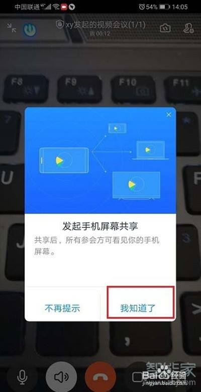 5、弹出框之后,点击知道了,许可手机录制屏幕,就当作功共享手机屏幕了