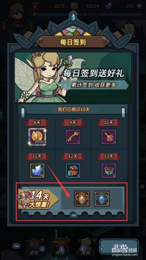 接下来,在每日签到本家儿界面,我们点击十四天大惊醒,就能领取签到惊喜礼包了;