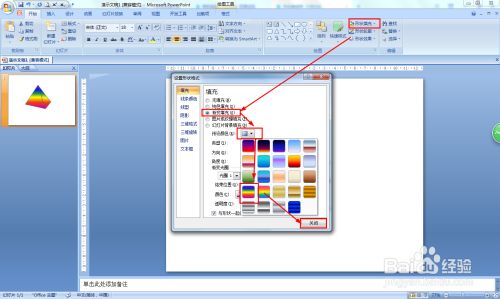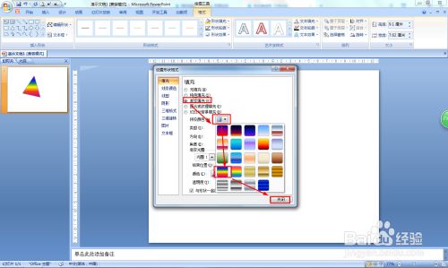 点击渐变填充——点击预设的下拉箭头——选择彩虹样式——点击封闭。