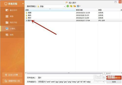 2、在电脑里选中要插入的图片位置,选中要插入的图片——打开。
