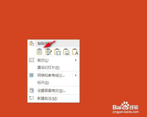 3、在PPT空白处单击右键选择第一个粘贴方针样式。