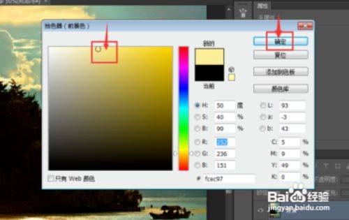 点击前景色,选择黄色,按确定;