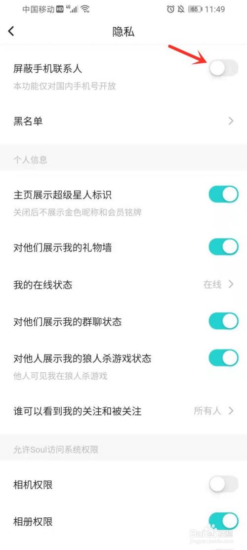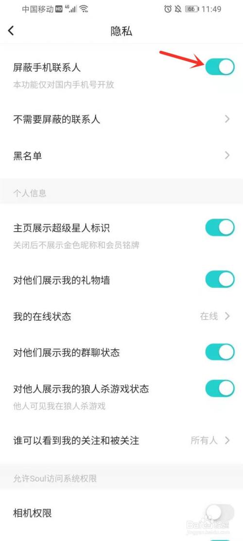 打开“屏障手机联系人”右侧的开关。