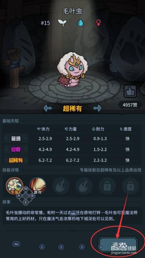最后,在我们返回到该契约兽的图鉴界面后,我们点击该界面右下角的【退出】按钮,退出毛叶虫的图鉴界面即可。